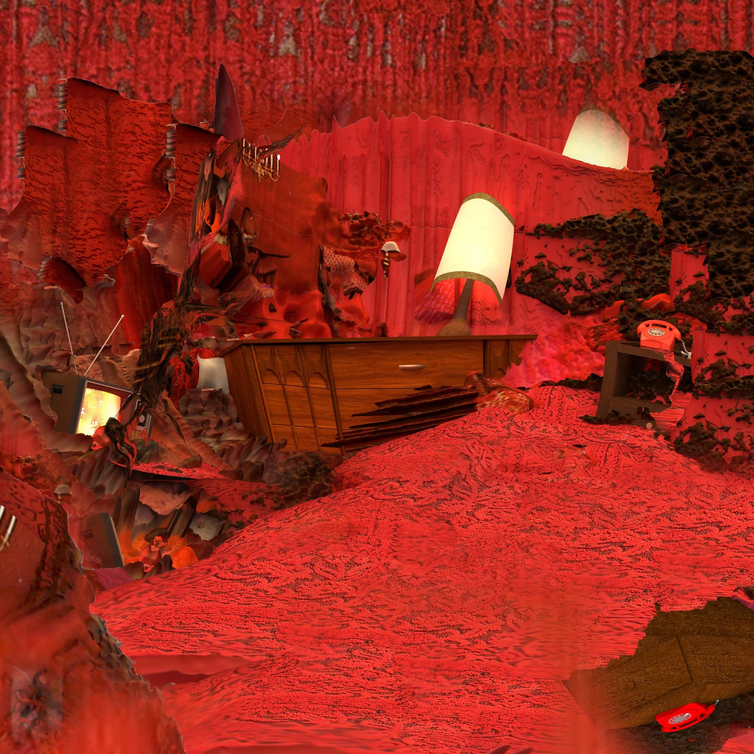 // Prevailing social conditions have pushed us into the deepest recesses of architecture’s inside, simultaneously broadcasting these intimate spaces on screens ad infinitum via the cloud. Our acute habitation of the interior, paradoxically, disconnects us from the physical environment. The American motel exemplifies this reciprocity, where illicit activity “is at once sheltered and hidden, kept apart without however being left in the open” (Foucault 1986). The midcentury motel sought visual distinction in groovy atmospheres that absorbed furnishings and architecture with blankets of shaggy carpeting and luscious cascading textiles, all of which glisten with the waxy luster of polyurethane. The double entendre is not lost on these vivid and highly coordinated displays where, indeed, the carpet matches the drapes. Today, wireless internet, flat-screen TVs, and minibar fridges have become the motel’s primary amenities, where stylized interiors have been relegated to social media feeds. Both material and technological episodes emphasize the motel as an artificial construction. This project returns these interiors to an altered object status with the assistance of image-based neural networks and 3D texture mapping. The ancillary aesthetic characteristics of the motel room present an alternative material artifice for architecture to recuperate lost intimacy with the material realm.